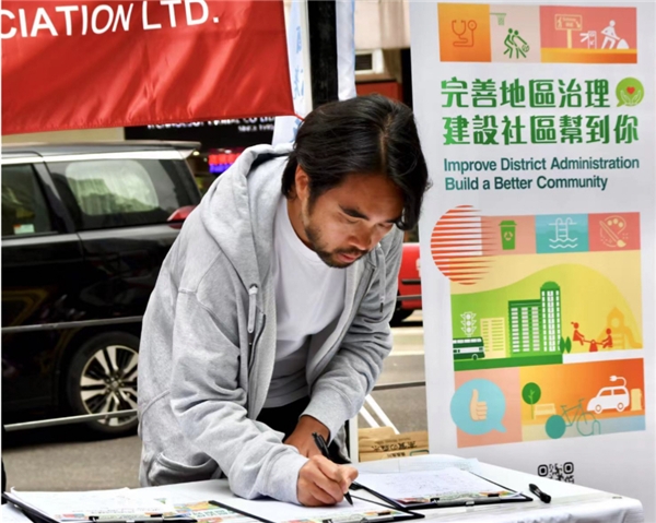 5月7日,第十四屆全國(guó)政協(xié)委員,新世界發(fā)展有限公司行政總裁鄭志剛在“香港友好協(xié)進(jìn)會(huì)”與各界人士一起,向市民宣講香港完善地區(qū)治理的方案,并收集市民支持簽名。