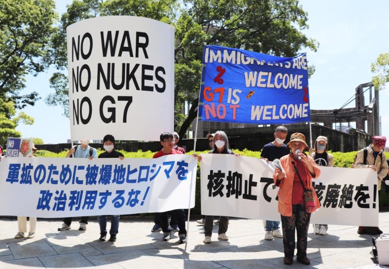 為給G7峰會造勢,日本首相岸田文雄從年初就開始頻繁出訪。他13日前往自己老家廣島,視察會場準(zhǔn)備情況。當(dāng)日,約200名日本民眾在廣島召開演講集會,譴責(zé)G7峰會打著“自由民主”旗號,行“軍事同盟”之實。