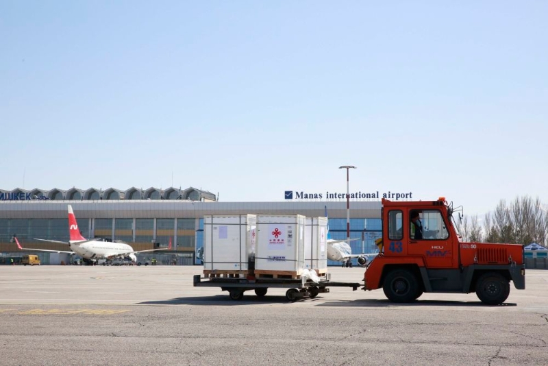 在吉爾吉斯斯坦比什凱克瑪納斯國際機場,工人轉(zhuǎn)運新冠疫苗(2021年3月19日攝)。新華社發(fā)(羅曼攝)