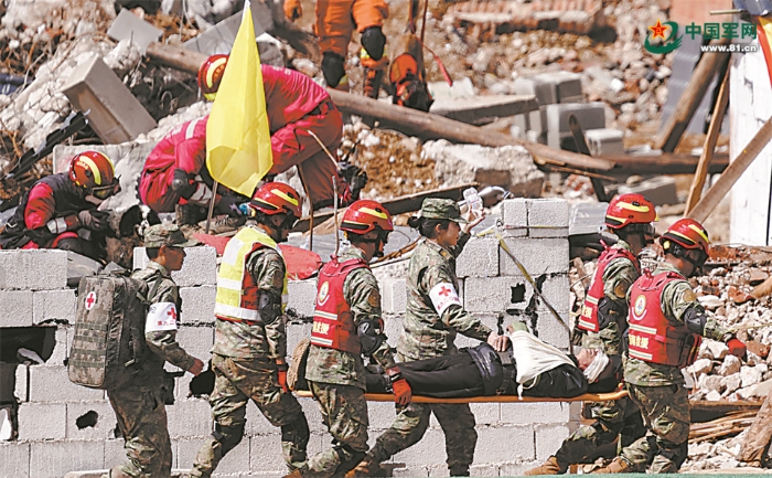 救援官兵轉(zhuǎn)運(yùn)“受傷群眾”。