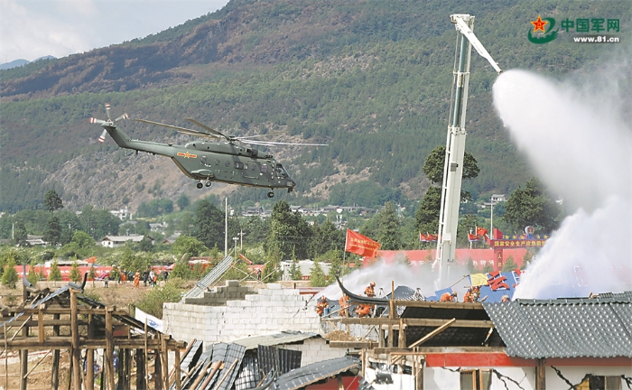 軍地救援人員緊急出動(dòng),撲救“地震”引發(fā)的“火災(zāi)”。