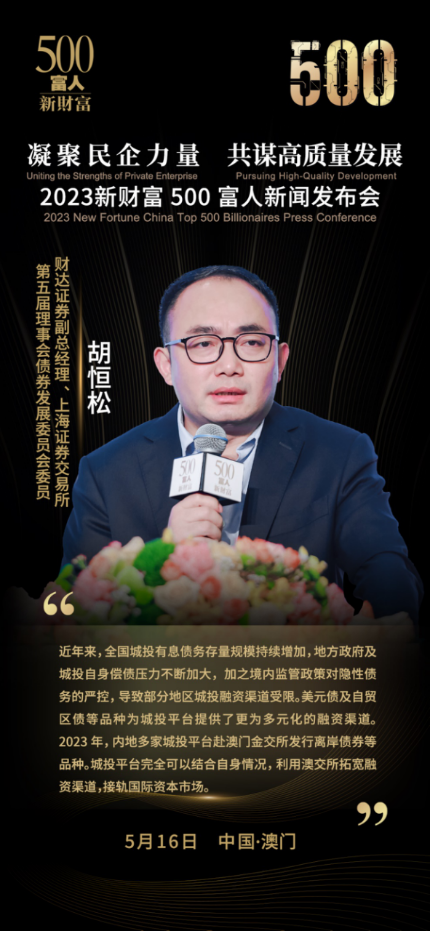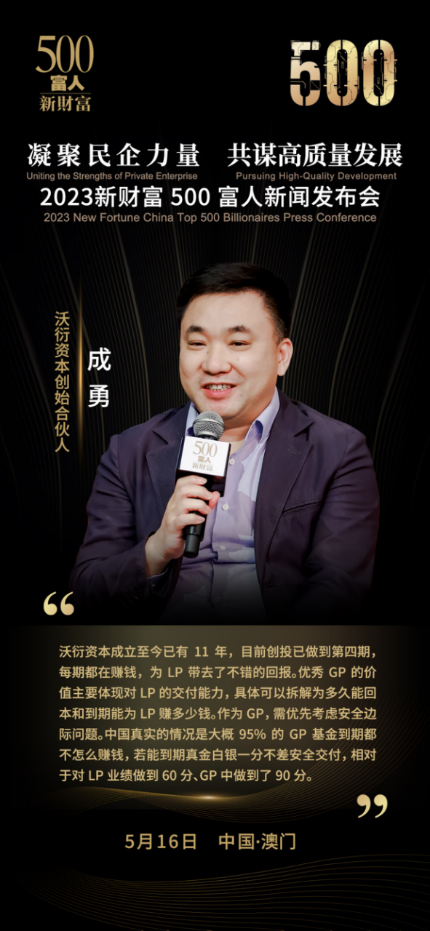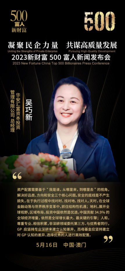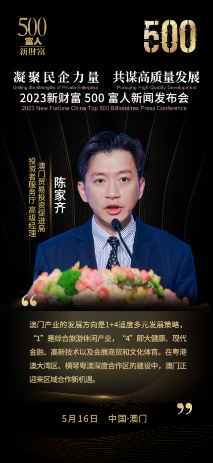 2023年5月16日,“凝聚民企力量,共謀高質(zhì)量發(fā)展”2023新財(cái)富500富人新聞發(fā)布會(huì)在中國(guó)澳門舉行。各方嘉賓匯聚一堂,共同見(jiàn)證中國(guó)經(jīng)濟(jì)轉(zhuǎn)型升級(jí)中的民企力量,盤點(diǎn)中國(guó)企業(yè)家創(chuàng)富的躍遷之路。