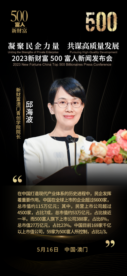 隨后,新財(cái)富澳門青創(chuàng)學(xué)院院長(zhǎng)邱海波分享了對(duì)2023新財(cái)富500富人新動(dòng)向的觀察。她指出,在中國(guó)打造現(xiàn)代產(chǎn)業(yè)體系的歷史進(jìn)程中,民企發(fā)揮著重要作用。中國(guó)在全球上市的企業(yè)超過(guò)6600家,總市值約115萬(wàn)億元;其中,民營(yíng)上市公司超過(guò)4500家,占了7成,總市值約53萬(wàn)億元,占比接近一半。而500富人旗下上市公司388家,占6%,總市值27萬(wàn)億元,占23%。中國(guó)目前169家千億以上市值公司,59家為500富人所控制,占比為1/3。