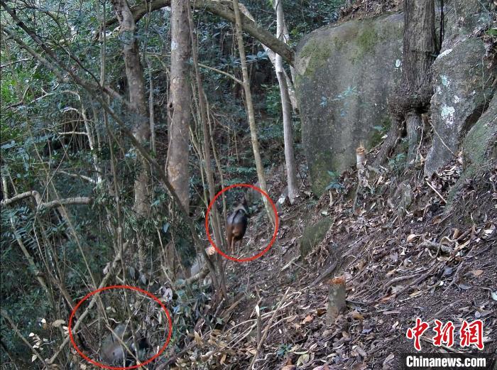 廣東象頭山保護(hù)區(qū)布設(shè)的紅外相機(jī)拍攝到兩頭中華鬣羚(紅圈內(nèi)) 廣東省林業(yè)局 供圖
