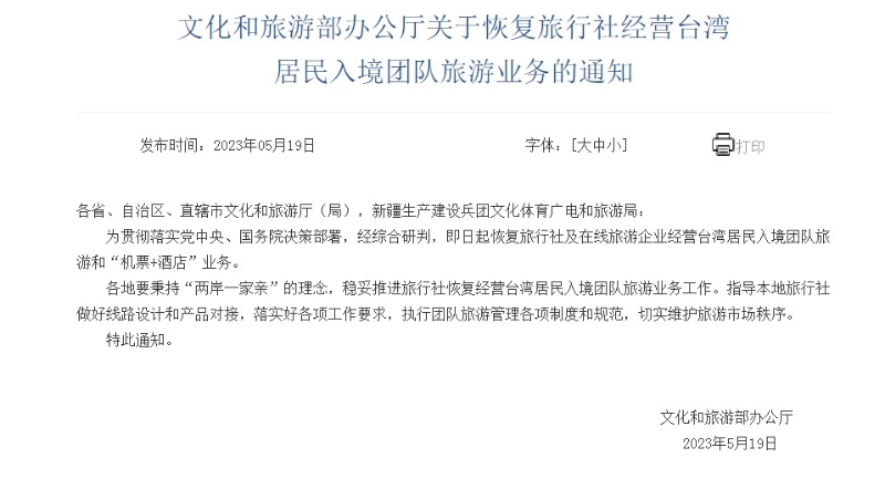 通知表示,經(jīng)綜合研判,即日起恢復(fù)旅行社及在線(xiàn)旅游企業(yè)經(jīng)營(yíng)臺(tái)灣居民入境團(tuán)隊(duì)旅游和“機(jī)票+酒店”業(yè)務(wù)。