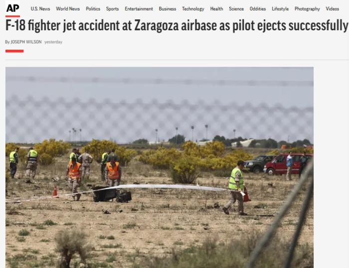 中新網5月12日 據美聯社報道,當地時間20日,西班牙國防部表示,一架F-18 戰(zhàn)斗機在中部城市薩拉戈薩的一個空軍基地進行飛行表演訓練時墜毀,但飛行員成功彈射逃生。