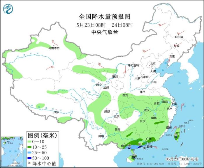 5月23日08時至24日08時,華南南部、臺灣島等地部分地區(qū)有中到大雨,其中,廣西東南部沿海、廣東西南部沿海等地局地有暴雨(50~90毫米)。新疆、內蒙古中西部和東北部等地部分地區(qū)有4~6級風。