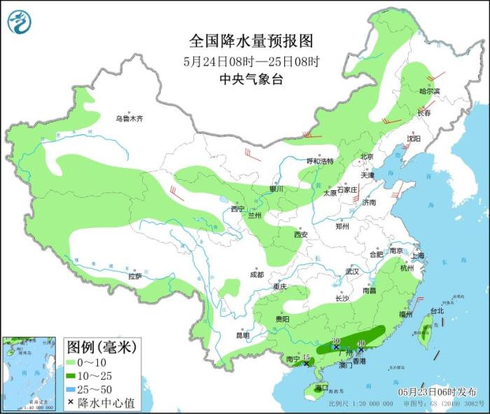 5月24日08時至25日08時,內蒙古中東部、東北地區(qū)西部、新疆伊犁河谷和南部、西北地區(qū)中東部、華北北部、江南東部和南部、西南地區(qū)東部、華南、臺灣島等地部分地區(qū)有小到中雨,其中,廣東中南部等地局地有大雨(25~40毫米)。內蒙古、東北地區(qū)、華北東部、黃淮東部等地部分地區(qū)有4~6級風,其中,內蒙古西部部分地區(qū)有6~7級風。