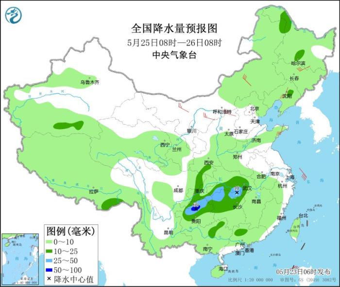 5月25日08時至26日08時,內蒙古東北部、黑龍江南部、遼寧中北部、江漢、江南北部、西南地區(qū)東部、廣西東北部等地部分地區(qū)有中到大雨,其中,貴州北部等地部分地區(qū)有暴雨(50~60毫米)。內蒙古、東北地區(qū)、山東半島等地的部分地區(qū)有4~6級風。