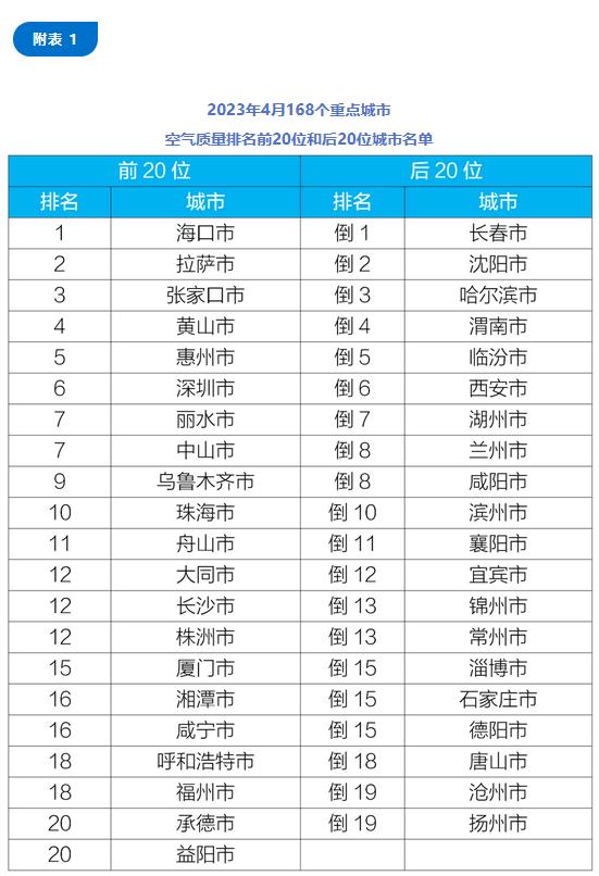 重點城市排名。4月,168個重點城市中,??凇⒗_和張家口等城市空氣質(zhì)量相對較好(從第1名至并列第20名);長春、沈陽和哈爾濱等城市空氣質(zhì)量相對較差(從倒數(shù)第1名至并列倒數(shù)第19名)。