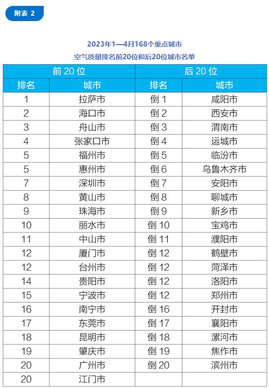 1—4月,168個重點城市中,拉薩、??诤椭凵降瘸鞘锌諝赓|(zhì)量相對較好(從第1名至并列第20名);咸陽、西安和渭南等城市空氣質(zhì)量相對較差(從倒數(shù)第1名至倒數(shù)第20名)。