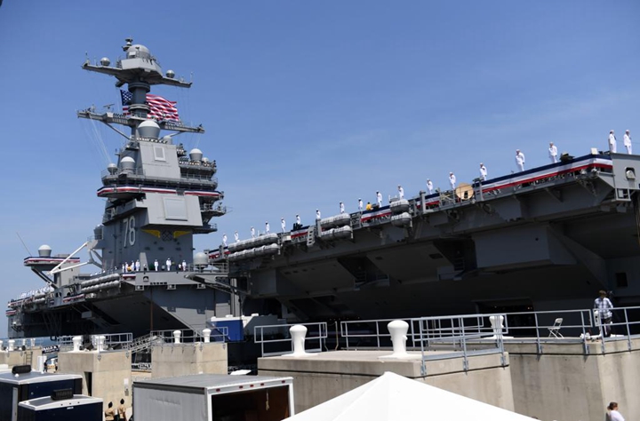 2017年7月22日,在美國弗吉尼亞州諾??撕\娀?,“福特”號(hào)航母的士兵參加服役儀式。新華社記者殷博古攝