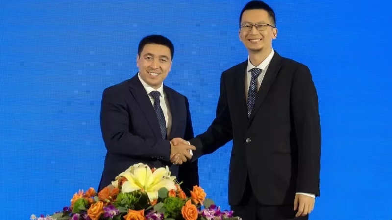(HTA總經(jīng)理Adilbek Gayev(左)與金旅海外銷售公司總經(jīng)理安敏(右)簽訂戰(zhàn)略合作協(xié)議)