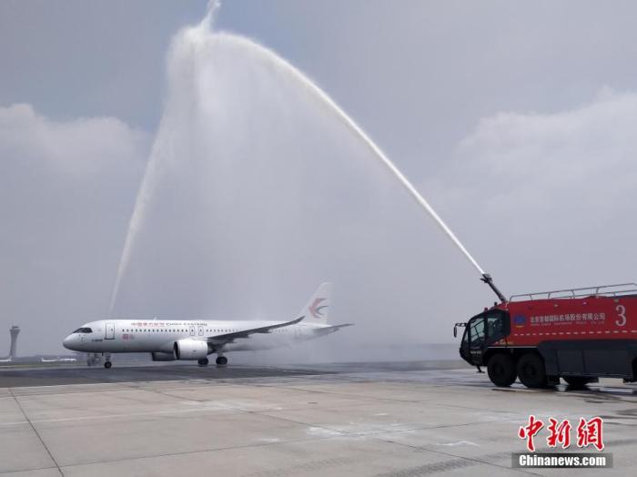 C919商業(yè)航班首飛抵達(dá)北京過(guò)“水門(mén)”。東航供圖