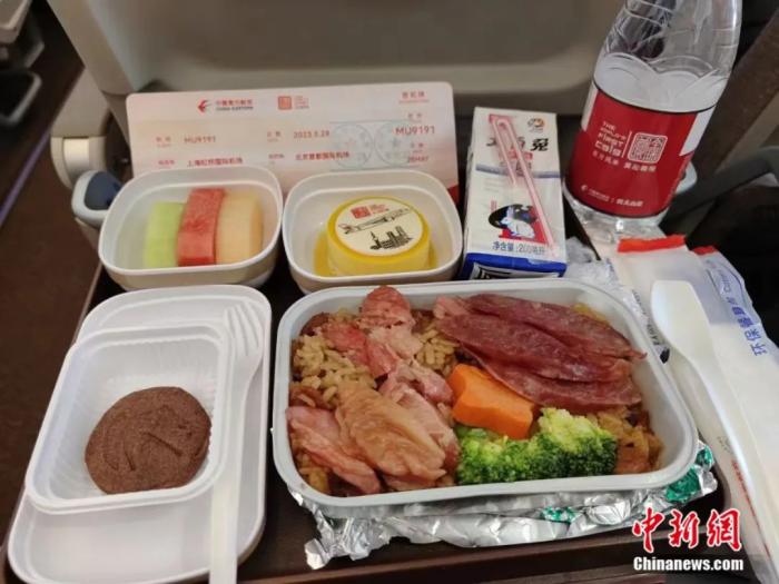 由旅客投票選出的主題餐食也在航班上亮相。據(jù)央視新聞報(bào)道,航班經(jīng)濟(jì)艙有款餐食叫“五福臨門(mén)”,主食是臘味煲仔飯,搭配三色水果拼盤(pán)、C919首航特色芒果布丁、東航自制巧克力酥餅和牛奶。