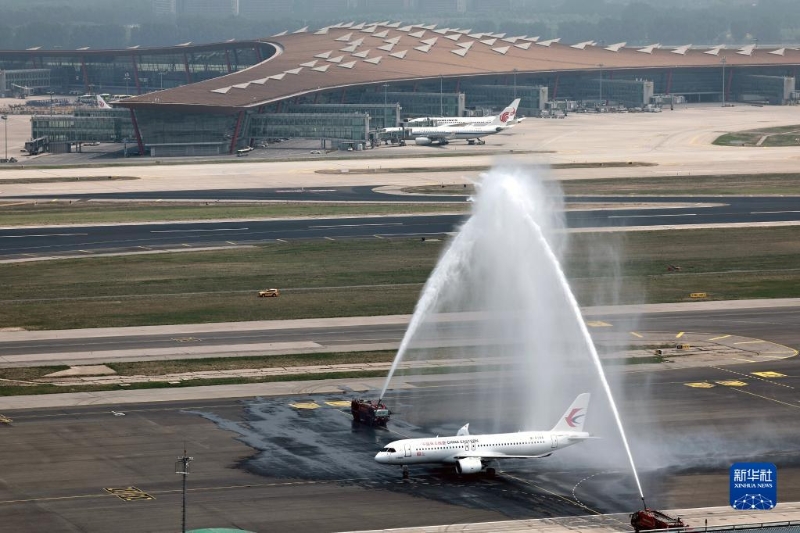 5月28日,北京首都國際機場以水門禮迎接C919首個商業(yè)航班東航MU9191。