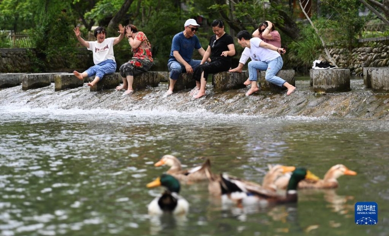 5月27日,游客在貴州省銅仁市江口縣太平鎮(zhèn)云舍景區(qū)小溪邊休憩。