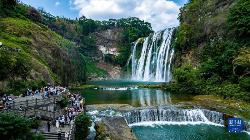 5月27日,游客在位于貴州省安順市的黃果樹瀑布景區(qū)游覽(無人機照片)。