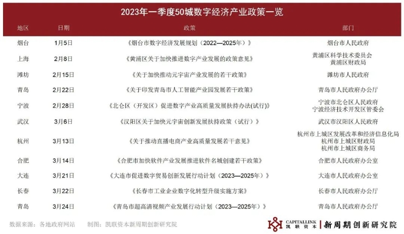 各地也根據(jù)自身的發(fā)展情況和優(yōu)勢產(chǎn)業(yè),布局數(shù)字經(jīng)濟發(fā)展賽道。上海黃浦區(qū)在2023年2月8日印發(fā)《黃浦區(qū)關(guān)于加快推進數(shù)字產(chǎn)業(yè)發(fā)展的政策意見》;武漢漢陽區(qū)在2023年3月6日推出《漢陽區(qū)關(guān)于加快元宇宙創(chuàng)新發(fā)展扶持政策(試行)》;青島市在2023年2月22日印發(fā)《青島市人工智能產(chǎn)業(yè)園發(fā)展若干政策》……
