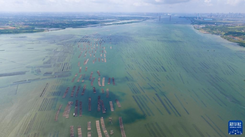 湛江市坡頭區(qū)官渡鎮(zhèn)的生蠔養(yǎng)殖場(5月26日攝,無人機(jī)照片)。官渡鎮(zhèn)處在海河交匯處,這里水質(zhì)優(yōu)良,咸淡適宜,富含微生物,為生蠔的生長提供了豐富的營養(yǎng)。