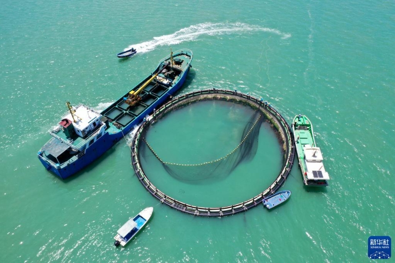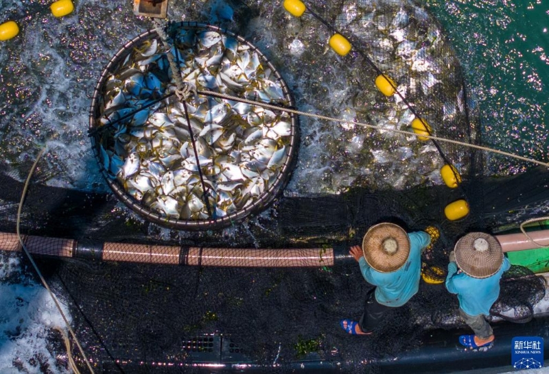 在湛江徐聞西連鎮(zhèn),漁業(yè)工人從深海網(wǎng)箱中打撈金鯧魚(5月27日攝,無人機(jī)照片)。廣東省湛江市是全國最大的金鯧魚養(yǎng)殖基地之一,被譽(yù)為“中國金鯧魚之都”。