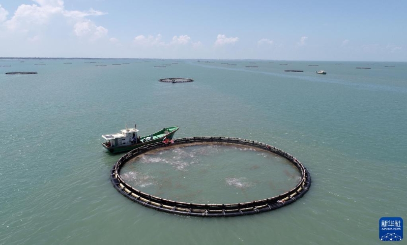 在湛江市徐聞縣西連鎮(zhèn)的“海上牧場”,漁業(yè)工人在喂魚(5月27日攝,無人機(jī)照片)。