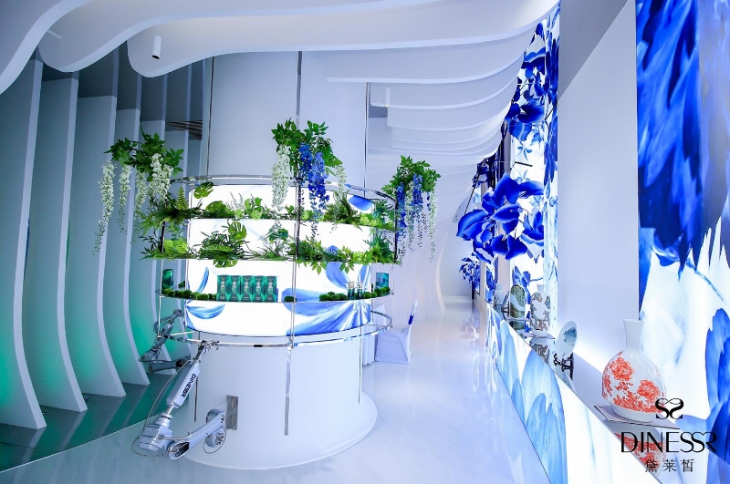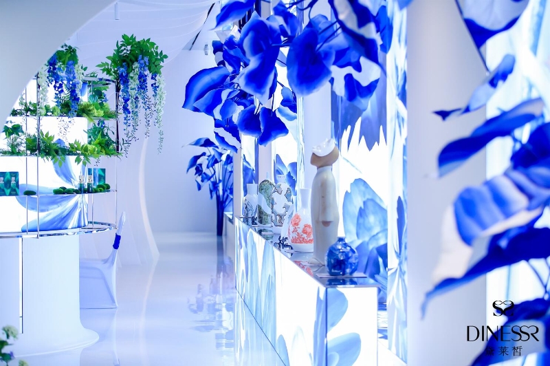作為新銳國貨護(hù)膚品牌,黛萊皙旗艦店不局限于傳統(tǒng)護(hù)膚品門店的定義,而是著力打造一個(gè)品牌文化內(nèi)涵展演的空間,以“東方青花”為主題,演繹“科技新國風(fēng)”的品牌美學(xué)觀點(diǎn)。店內(nèi)分為六大主題視覺區(qū),分別為:“鳳舞九天”、“深林神話”、“化繭成蝶”、“未來之種”、“瓷美之詩”、“宮廷雅奢”,六個(gè)區(qū)域共同組成了黛萊皙的品牌美學(xué)藝術(shù)陳列。主題展演在六大主題視覺區(qū)依次呈現(xiàn),活動(dòng)形式包含視覺表演、陶藝體驗(yàn)、護(hù)膚產(chǎn)品體驗(yàn)等。