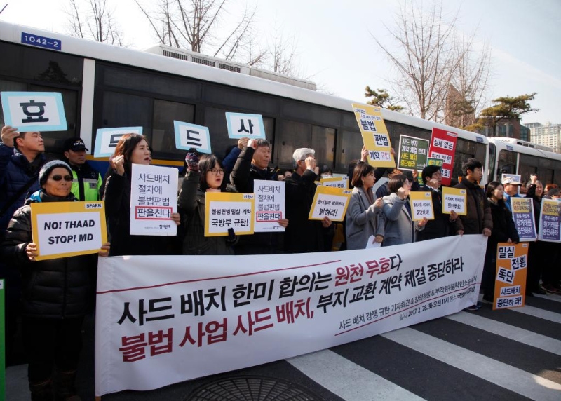 2017年2月28日,在韓國首爾的韓國國防部門前,韓國民眾高舉反對“薩德”系統(tǒng)的標(biāo)語。新華社記者 姚琪琳 攝