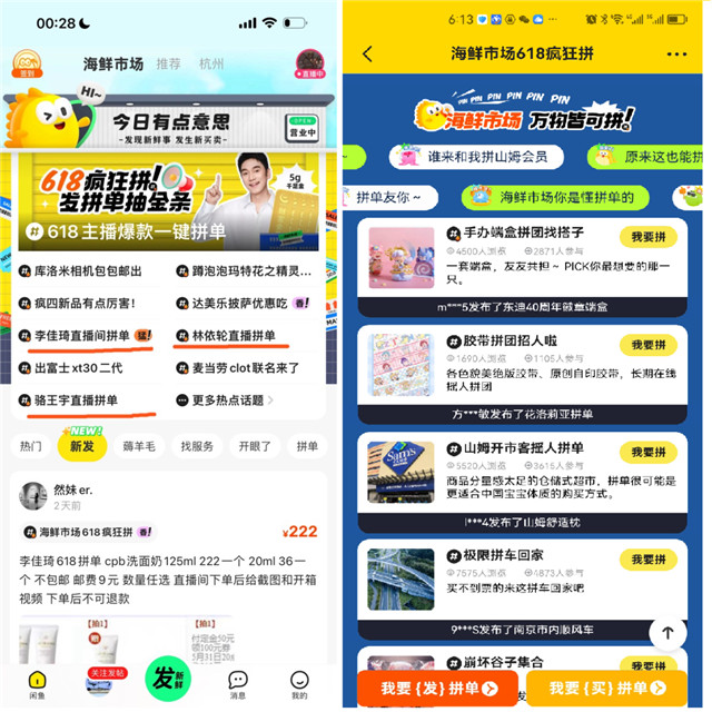 數(shù)據(jù)顯示,在平臺(tái)發(fā)起“618瘋狂拼活動(dòng)”期間,閑魚「海鮮市場」三天涌現(xiàn)出30多個(gè)拼單相關(guān)熱點(diǎn)話題,整體拼單需求發(fā)布量較去年翻倍。數(shù)十萬“拼單搭子”結(jié)伴蹲守李佳琦、林依輪、交個(gè)朋友、駱王宇等流量主播及各大熱門品牌直播間,享受拼單帶來的實(shí)惠和樂趣。