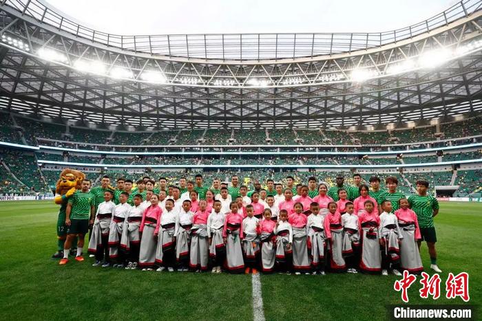 當晚,北京工人體育場迎來北京國安主場對陣長春亞泰的中超第11輪比賽。6名來自青海省玉樹州兒童福利院的藏族青少年,作為球童與球員牽手入場。入場前,球場大屏播放著玉樹青少年主題視頻,環(huán)形LED屏幕用中文、藏文雙語展示著一個個藏族孩子的名字,賽場上響起不斷的吶喊和歡呼。