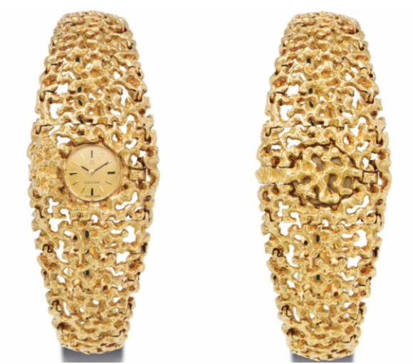 兩位著名的珠寶藝術(shù)大師Gilbert Albert和Andrew Grima于六、七十年與歐米茄緊密合作,創(chuàng)造出很多傳世佳品,也備受收藏家的青睞。其中Gilbert Albert設(shè)計(jì)制作的18K金鑲鉆石鏈帶腕表在2021年佳士得拍得25萬港幣。另一款是承襲Andrew Grima設(shè)計(jì)風(fēng)格的歐米茄碟飛“Jeux d'Argent”銀質(zhì)腕表則在富藝斯拍得近2萬瑞郎。