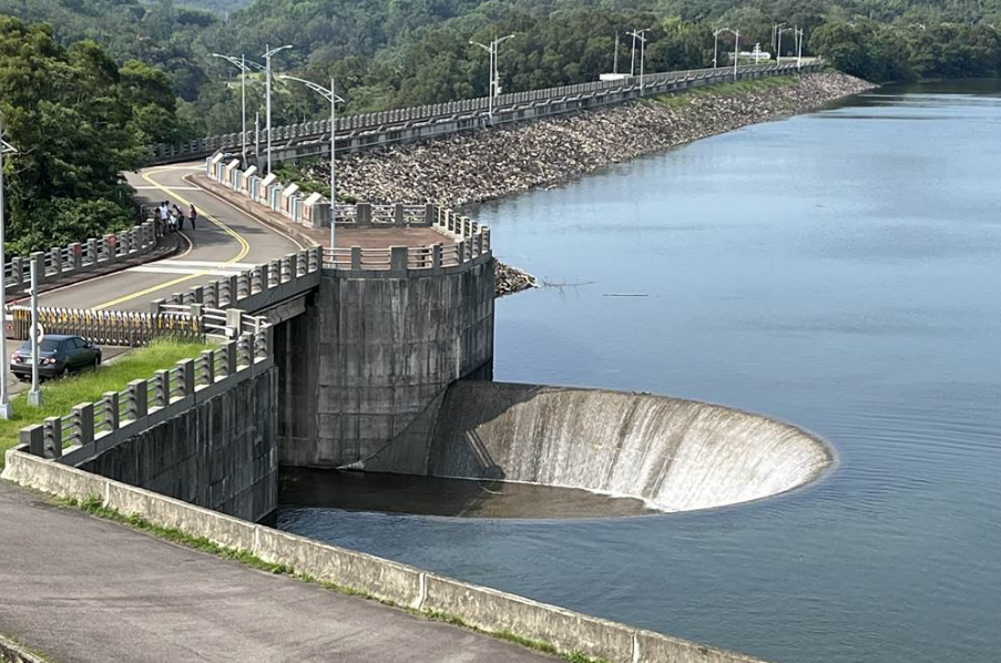新竹寶二水庫滿庫溢流當(dāng)中。