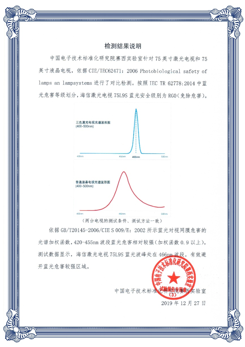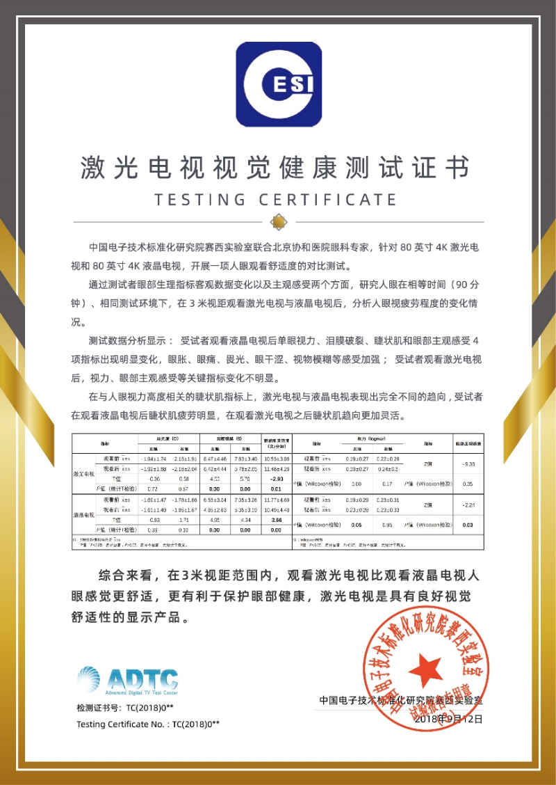 國家直屬權(quán)威檢測機構(gòu)中國電子技術(shù)標準化研究院賽西實驗室和北京協(xié)和醫(yī)院眼科專家,通過人群相同條件下觀看激光電視和液晶電視的嚴格對比試驗,測試數(shù)據(jù)分析顯示:受試者觀看液晶電視后單眼視力、淚膜破裂、睫狀肌和眼部主觀感受4項指標出現(xiàn)明顯變化,眼脹、眼痛、畏光、眼干澀、視物模糊等感受加強;受試者觀看激光電視后,視力、眼部主觀感受等關(guān)鍵指標變化不明顯。研究發(fā)現(xiàn):在3米視距范圍內(nèi),觀看激光電視比觀看液晶電視人眼感覺更舒適,更有利于保護眼部健康,激光電視是具有良好視覺舒適性的顯示產(chǎn)品。