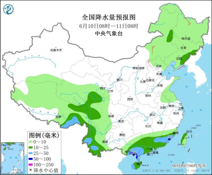 6月10日08時(shí)至11日08時(shí),內(nèi)蒙古東北部、遼寧東部、吉林東南部、西藏東部、青海東南部、四川西部、云南西部、廣西東部和南部、廣東、福建南部、海南島、臺(tái)灣島西部等地部分地區(qū)有中到大雨,其中,廣西東南部沿海、福建南部、廣東西南部等地局地有暴雨或大暴雨(100~150毫米)。內(nèi)蒙古中部、黑龍江北部、河北西北部等地部分地區(qū)有4~6級(jí)風(fēng)(見(jiàn)圖3)。