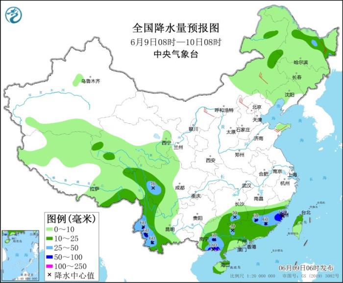 6月9日08時(shí)至10日08時(shí),廣西南部和東北部、湖南南部、江西南部、福建中南部、廣東西北部、云南西部、四川西部等地部分地區(qū)有大到暴雨,其中,福建東部沿海、廣西東南部沿海等地局地有大暴雨(100~180毫米)。內(nèi)蒙古中西部、黑龍江東部、河北西北部、山東半島等地部分地區(qū)有4~6級(jí)風(fēng)(見(jiàn)圖2)。日照和連云港沿岸海域?qū)⒂?~10級(jí)雷暴大風(fēng)。