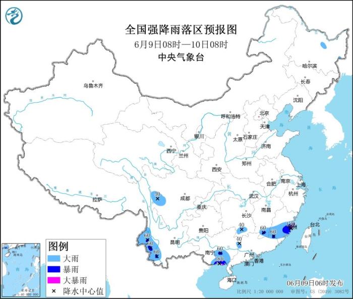 9日至11日,江南、華南、云南等地有中到大雨,局地有暴雨或大暴雨,小時(shí)雨量20~50毫米,局地可達(dá)60毫米以上;預(yù)計(jì)6月9日08時(shí)至10日08時(shí),廣西南部和東北部、湖南南部、江西南部、福建中南部、廣東西北部、云南西部、四川西部等地部分地區(qū)有大到暴雨,其中,福建東部沿海、廣西東南部沿海等地局地有大暴雨(100~180毫米)。上述部分地區(qū)伴有短時(shí)強(qiáng)降水,局地有雷暴大風(fēng)或冰雹等強(qiáng)對(duì)流天氣。中央氣象臺(tái)6月9日06時(shí)繼續(xù)發(fā)布暴雨藍(lán)色預(yù)警(見(jiàn)圖1)。