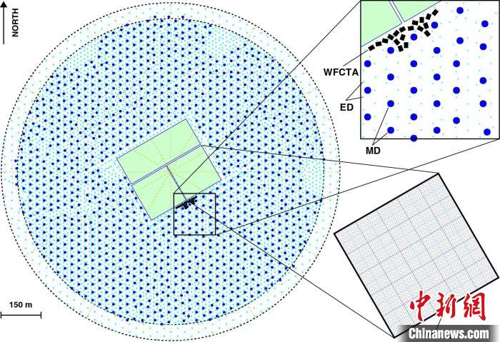 高海拔宇宙線觀測站(“拉索”)的構(gòu)成與布局示意圖?!≈锌圃焊吣芩?供圖