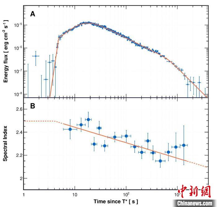美國藝術(shù)與科學(xué)院院士、伽馬射線暴火球模型奠基人彼得·梅斯扎羅斯(Peter Meszaros)教授評價稱,得益于“拉索”巨大的觀測面積和先進(jìn)的探測器技術(shù),這是首次探測到萬億電子伏特(TeV)能區(qū)的早期余輝光變曲線,光變曲線顯示出減速特征,還觀測到光變曲線的截斷現(xiàn)象,相關(guān)計算結(jié)果與其他伽馬射線暴一致。