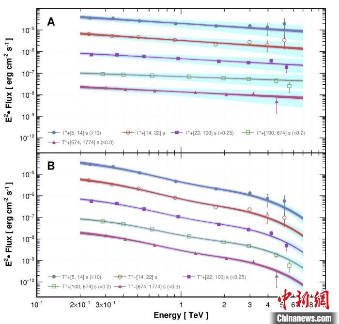 “拉索”測量得到的GRB221009A在5個時間段的本征譜與觀測譜,約在2千億到7萬億電子伏特之間?!≈锌圃焊吣芩?供圖