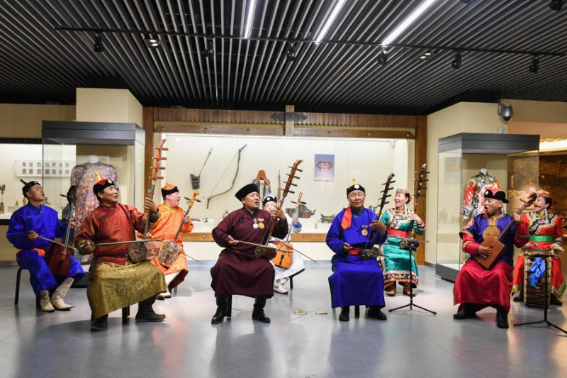在赤峰博物館,《格薩(斯)爾》國家級(jí)非遺傳承人金巴扎木蘇(前排右二)和團(tuán)隊(duì)一起表演節(jié)目。新華社記者 劉磊 攝