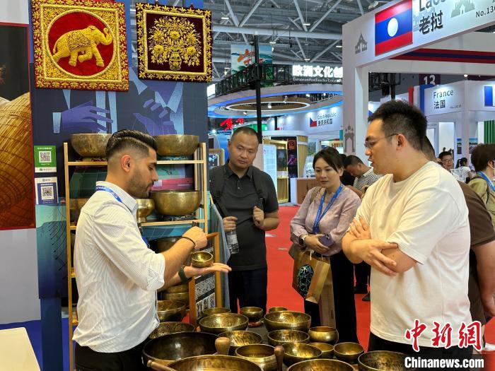 走進展館,記者被尼泊爾展臺處深沉悠遠的聲音吸引。第一次參加文博會的尼泊爾參展商弗蘭克(音譯)向觀眾演示著頌缽。他說:“我們從尼泊爾帶來頌缽,很多人聽說過這個東西是做療愈、做冥想的。”