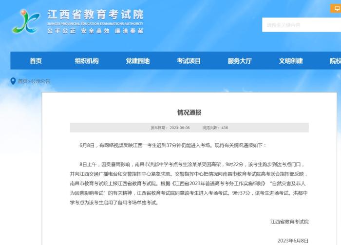 8日上午,因受暴雨影響,南昌市洪都中學(xué)考點考生涂某某受困高架,9時22分,該考生跑步到達考點門口,并向江西交通廣播電臺和交警指揮中心緊急求助。交警指揮中心把情況向南昌市教育考試院高考聯(lián)合指揮部反映,南昌市教育考試院上報江西省教育考試院。根據(jù)《江西省2023年普通高考考務(wù)工作實施細則》“自然災(zāi)害及非人為因素影響考試”的有關(guān)精神,江西省教育考試院同意該考生進入考場考試。9時37分,該考生進場考試。洪都中學(xué)考點為該考生啟用了備用考場單獨考試。