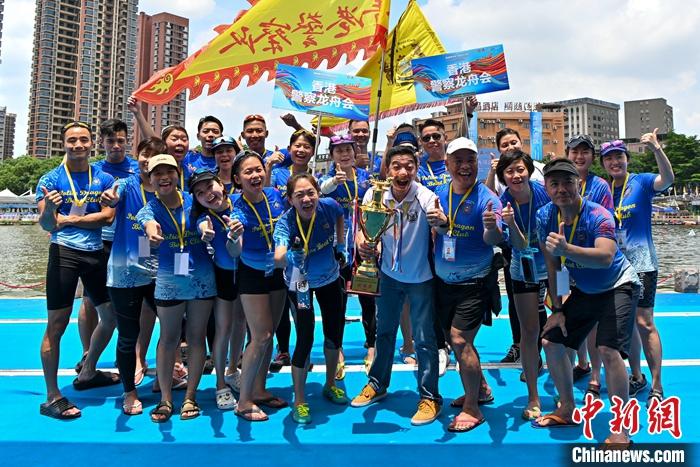 圖為香港警察龍舟會隊員們在賽后捧起獎杯合影。 中新社記者 陳驥旻 攝