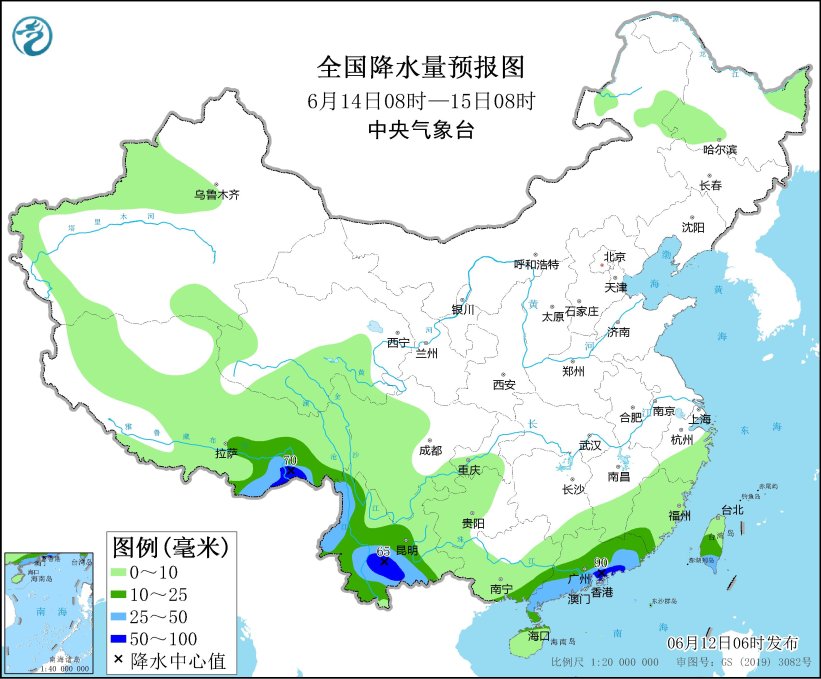 6月14日08時(shí)至15日08時(shí),云南中南部和西部、廣西南部、廣東中南部、臺(tái)灣島中南部、西藏東南部等地有大雨,局部地區(qū)有暴雨(50~90毫米)(見(jiàn)圖4)。