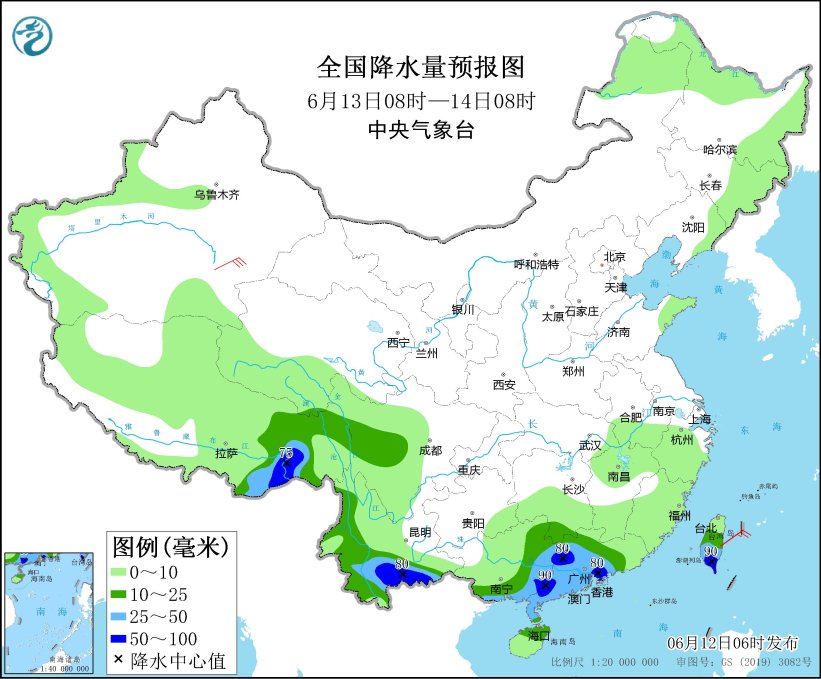 6月13日08時(shí)至14日08時(shí),云南南部、廣西南部和東部、廣東大部、臺(tái)灣島中南部、西藏東南部等地有大雨,局部地區(qū)有暴雨(50~90毫米)。新疆東部等地有5~6級(jí)風(fēng)(見(jiàn)圖3)。
