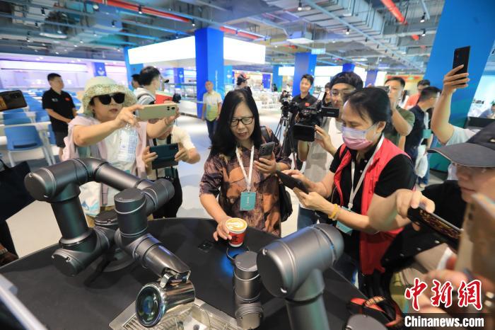 成都大運(yùn)村運(yùn)動(dòng)員餐廳擺放著一臺(tái)智能咖啡機(jī)器人,吸引了許多海外華文媒體的目光。他們紛紛品嘗著由機(jī)器人出品的各式咖啡,并拿出相機(jī)、手機(jī)等打卡記錄。