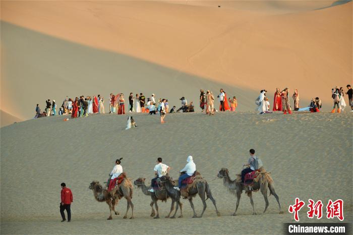 6月以來(lái),在“人流如潮、駝隊(duì)如龍”的敦煌大漠里,很多敦煌舞愛(ài)好者涌向敦煌,穿上以飛天服飾為代表的各種古裝,在絲綢之路旅游網(wǎng)紅“打卡地”鳴沙山月牙泉、玉門關(guān)、陽(yáng)關(guān)等景區(qū)拍照、直播,各種不同的古裝服飾也為“大漠孤煙直”的絲路古道增添了無(wú)限色彩。
