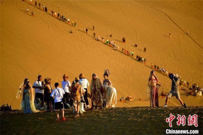 2023年6月7日,游客身著特色服飾和自己的旅拍團(tuán)隊(duì)在鳴沙山上拍攝敦煌旅拍紀(jì)念照?!⊥醣筱y 攝