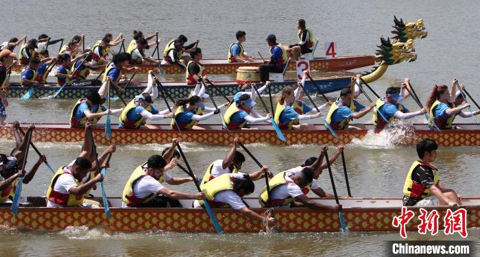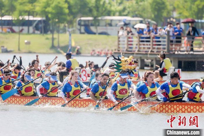 祈福、點睛、競渡,濃濃的中國風,滿滿的國際范兒。龍首沉浮,水花四濺,一條條龍舟在水面上劈波前行。槳聲擊水催奮進,如矢箭飛掠波瀾。