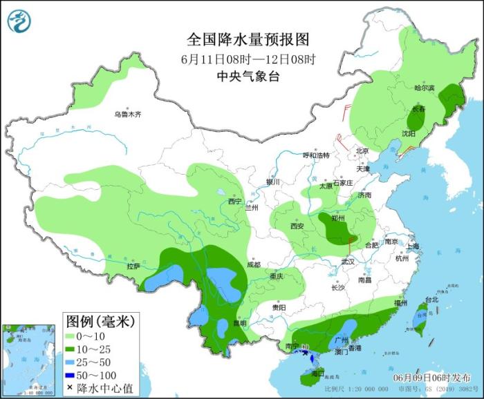 9日至11日,內(nèi)蒙古東部、東北地區(qū)、華北、黃淮等地有陣雨或雷陣雨天氣,局地有短時強降水、雷暴大風(fēng)或冰雹等強對流天氣。